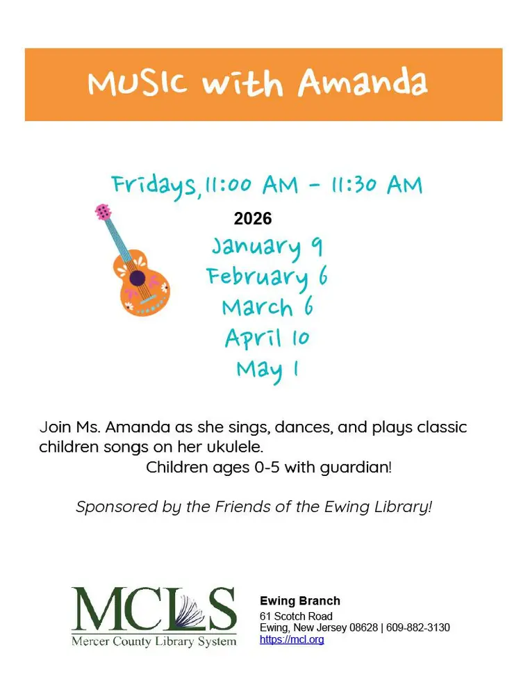 Music with Amanda - for children 0-5 with guardian. [Friday, April 10, 11-11:30am] Mercer County Library System, Ewing Branch, 61 Scotch Road, Ewing. Join Ms. Amanda as she sings, dances, and plays classic children songs on her ukulele.