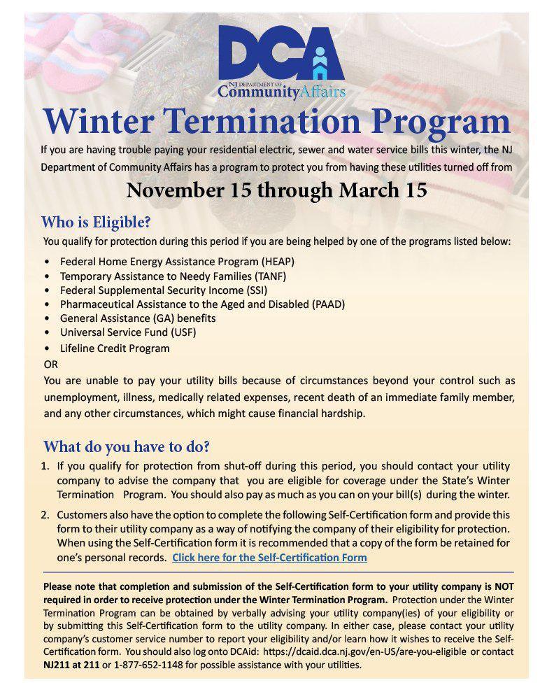 The Winter Termination Program by the NJ Department of Community Affairs begins today for the season: November 15th through March 15th!