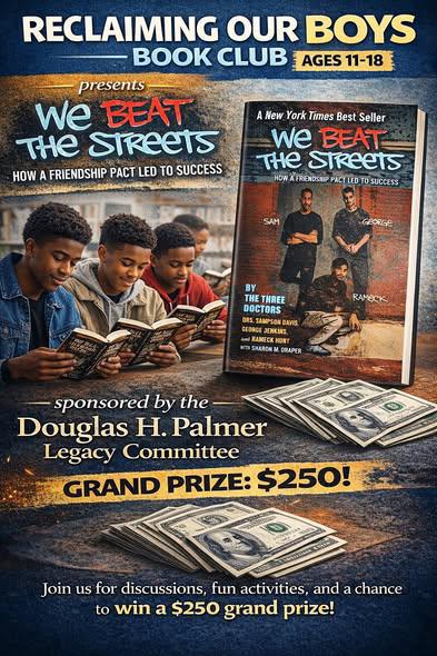 ¡PROGRAMA GRATUITO, GANA DINERO! Es fácil: únete a Reclaiming Our Boys los miércoles de 6:30 p. m. a 7:30 p. m., obtén un libro gratis, lee las páginas designadas, regresa y juega un juego de trivia sobre lo que leíste para acumular puntos. ¡El que más puntos consiga gana DINERO!