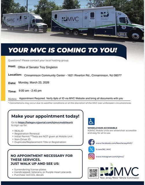 Residents must have an appointment and must bring their 6 points of ID which can be verified here https://www.nj.gov/mvc/realid/pdf/26.pdf Note: Disability placards and license plate surrenders do not need appointments.