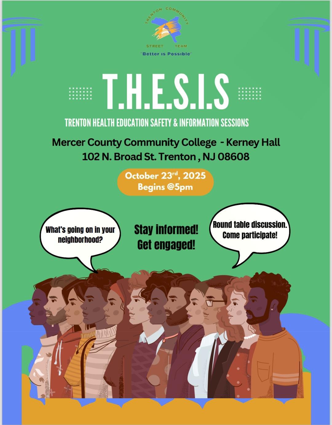 Trenton Health Education Safety & Information Sessions (T.H.E.S.I.S) are forums created to inform, engage & empower our community. It’s a monthly conversation that provides updated information and reports that benefits our community. T.H.E.S.I.S seeks to foster accountability by holding elected officials, service providers, and faith based organizations, accountable for services provided to Trentonian’s.